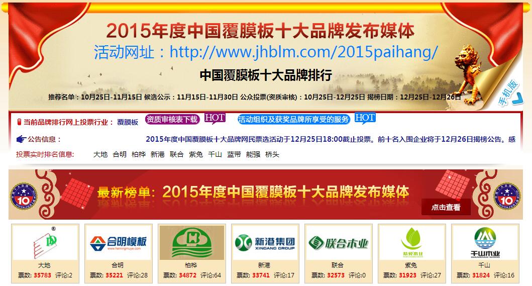 热烈祝贺合明木业荣获2015年度“中国覆膜板十大品牌”第二名。据悉,此次评选经过筛选国内具有代表性的覆膜板品牌上榜,再经过一个月网络投票,最终按照票数从高到低排列,前十名者入选。