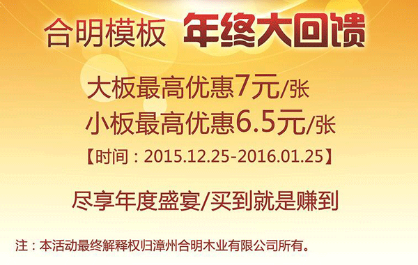 12月合明木业举办年终客户回馈活动,活动持续10天以来,客户反应热烈,浙江、江苏、福建、广东、江西、四川、陕西等地的客户纷纷下单,表示活动期间购买确实划算很多,平均一车模板就可省好多成本。不少经销商打算囤货,而工地客户则先下单预定,货再慢慢拉。