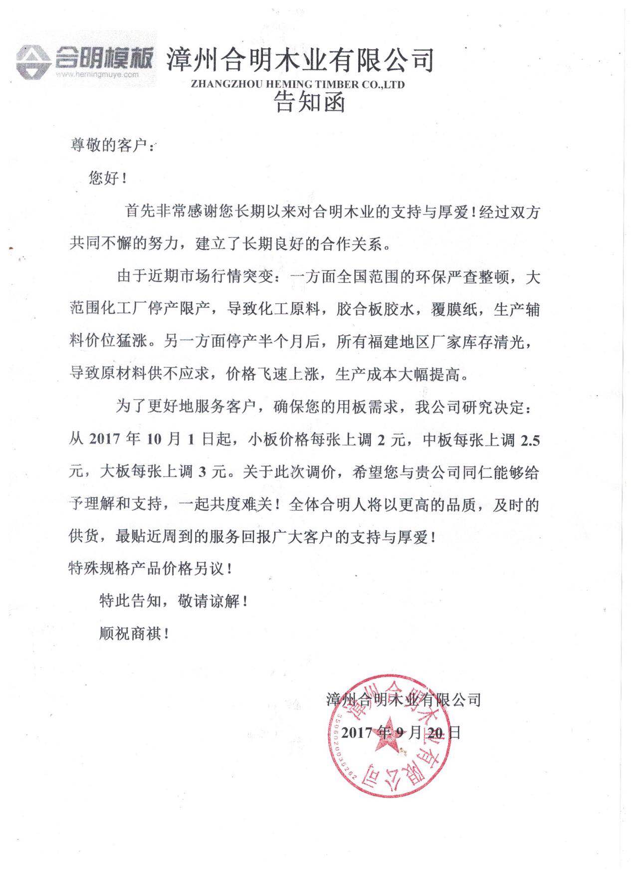 10月1日起合明模板开始执行上调价格。由于近期环保近期环保严查整顿,大范围化工厂停产限产导致化工原料,胶合板胶水,覆膜纸,生产辅料价位猛涨。另一方面金砖会议工厂停产半个月后,所有福建地区厂家库存清光,导致原材料供不应求,价格飞速上涨,生产成本大幅提高。迫于上游原材料匮缺导致价格暴涨,导致合明模板原材料价格猛涨,公司不得已进行上调价格!