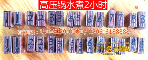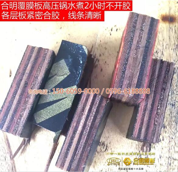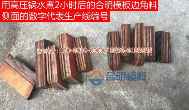 合明模板边角料(合明模板样板)在高压锅沸水煮2小时不开胶。一般在高压锅可以煮2小时不开胶的模板在工地使用中可周转8次以上。