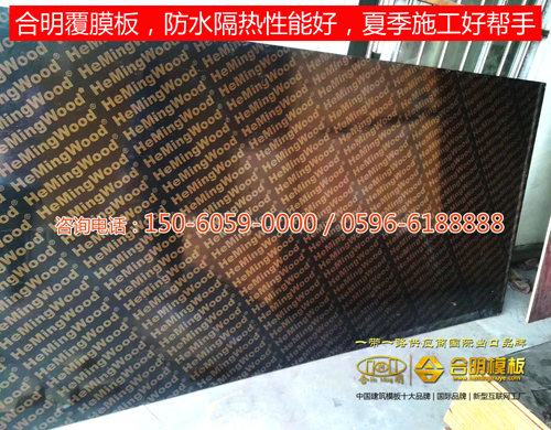 合明覆膜板,表层覆有浸渍纸薄膜,经高温高压长时间压制,防水隔热效果好,模板在正常使用下,可周转10次以上。内芯坚实,施工过程中不开胶,不爆板,顺利推进工程施工进度。