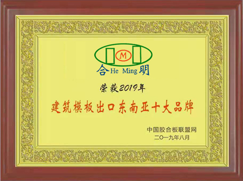 由于出口东南亚数额大、客户好评率高,合明模板被授予了“2019年建筑模板出口东南亚十大品牌”荣誉称号,这说明了合明模板良好的品牌形象,卓越的产品品质,以及强大的公司实力。