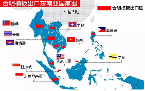 合明模板出口除了东帝汶外的全部东南亚国家,包括:越南、老挝、柬埔寨、泰国、缅甸、马来西亚、新加坡、印度尼西亚、文莱、菲律宾等10个国家。
