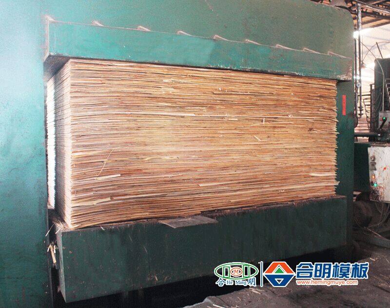 5、铺好覆膜的模板层进行热压,各层板再次紧紧结合,保证模板高压锅水煮5小时不开胶,也使模板表面更加平整。