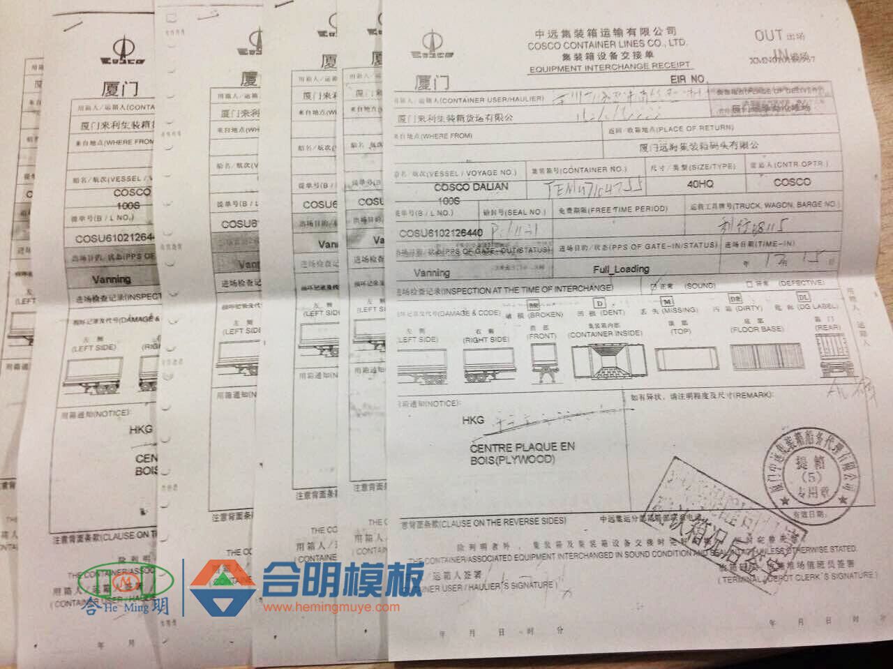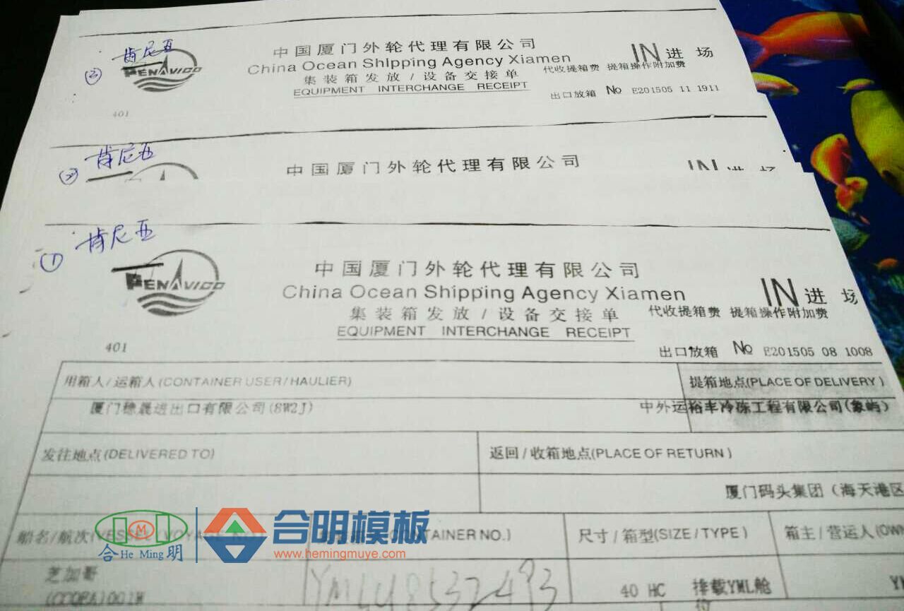 合明模板出口至各个国家的集装箱托运单