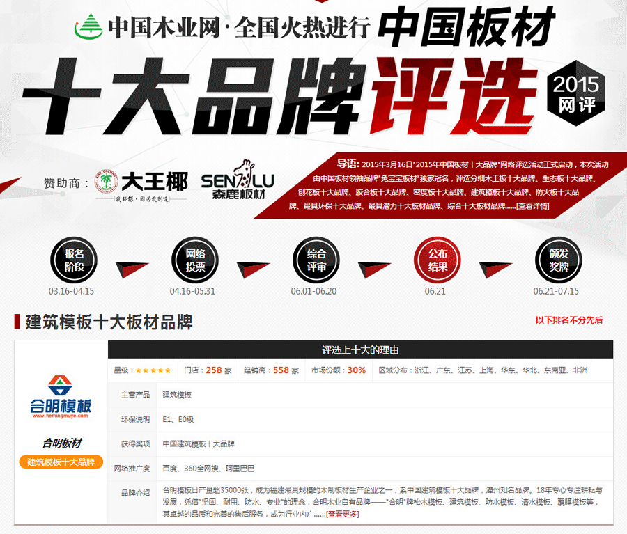 日前,进行了三个月的“2015中国板材十大品牌”网络评选活动正式画上休止符,本次活动由中国木业网举办,从各个分类中评选出了最佳十大板材。其中,出产于漳州的合明模板获得了“建筑模板十大板材品牌”的荣誉,同时也是福建省内唯一一家获得该荣誉的木业企业。