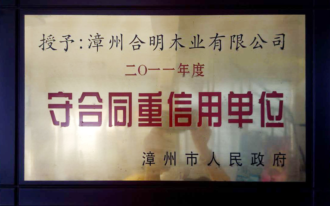 10、合明木业荣获“守合同重信用单位”,该荣誉由漳州市人民政府颁发。