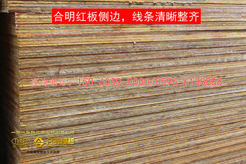 合明红板由一级桉木芯板和一级松木面板压制而成,其表面滚有合明自主研制的红色防水胶,每张红板面板滚1千克胶水,面胶层厚实,防水效果好。合明红板经18道扎实的制作工艺及细节处理,表面平整,结实耐磨,周转次数8次以上,相比市场上同等价格的模板更加耐用,广受建筑工地好评。