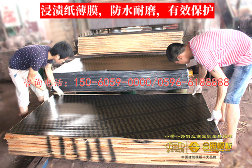 合明覆膜板表面覆有浸渍纸薄膜,这层浸渍纸薄膜经超高温超长时间压制,胶水及薄膜渗透均匀,使建筑模板表面更平整光滑,更加耐磨防水,大大延长了模板的使用寿命。