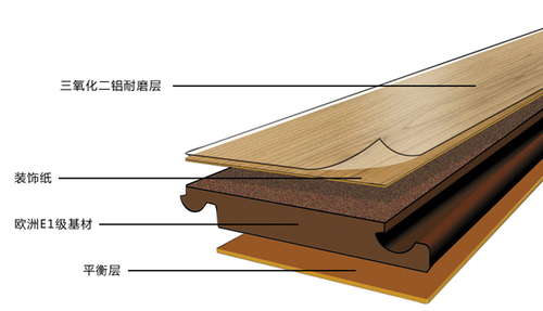 强化地板也称浸渍纸层压木质地板/强化木地板,其由耐磨层、装饰层、高密度基材层、平衡(防潮)层组成。浸渍纸层压木质地板是以一层或多层专用纸浸渍热固性氨基树脂,铺装在刨花板、高密度纤维板等人造板基材表层,背面加平衡层,正面加耐磨层,经热压、成型的地板。