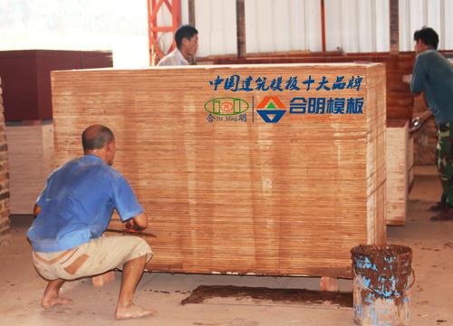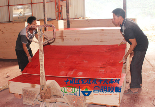 滚好面胶或者覆好膜的板,用热压机进行热压。合明热压机是全国领先新型热压机,可根据不同种类模板进行各种高温热压,热压时间超长,一般覆膜板130度以上热压,高脂覆膜板150度超高温热压,热压好的模板最多可周转38次。